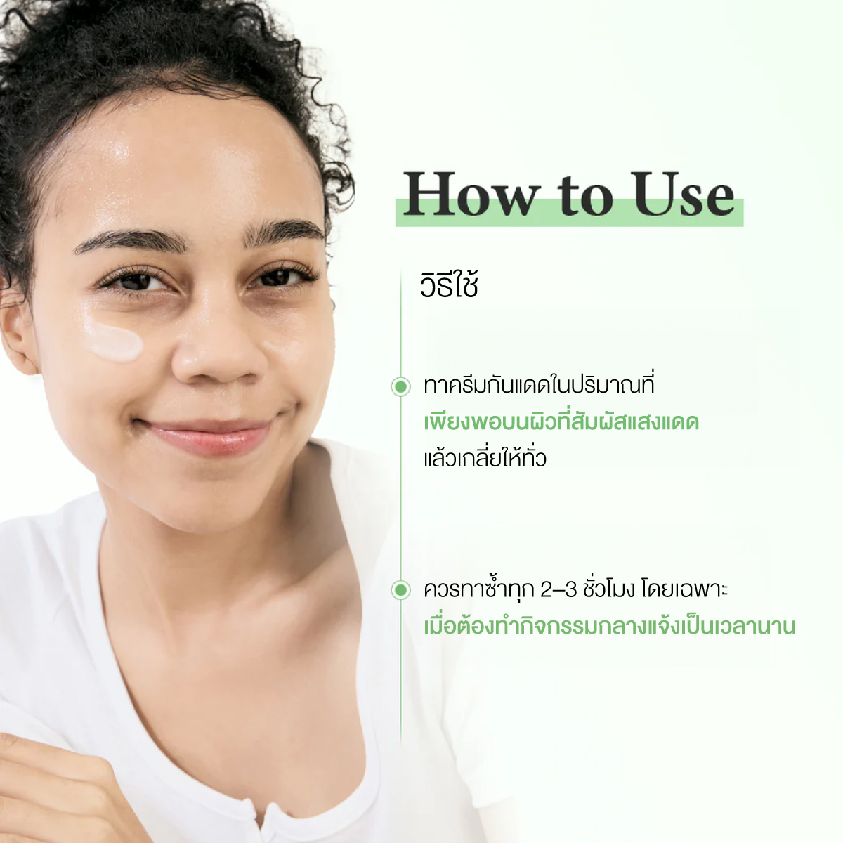 ** ทาซ้ำระหว่างวันเพื่อให้ผิวคงการปกป้องจากรังสียูวีอย่างต่อเนื่อง **